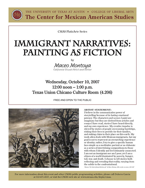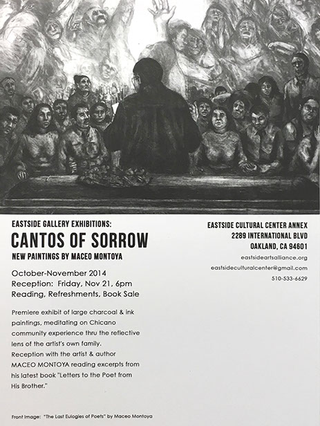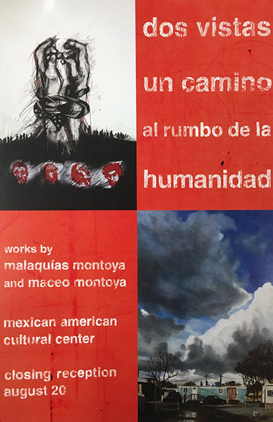 In the visual arts, Montoya’s paintings, drawings, and prints have been featured in exhibitions and publications throughout the country as well as internationally. He has collaborated with other writers on visual-textual projects, including David Montejano's Sancho's Journal, an ethnography of the Brown Berets in San Antonio, Laurie Ann Guerrero's A Crown for Gumecindo, Arturo Mantecon's translation of Mexican poet Mario Santiago Papasquiaro's Poetry Comes Out of My Mouth, and American Quasar, a collaboration with Fresno poet David Campos featuring nineteen of Montoya’s monoprints.