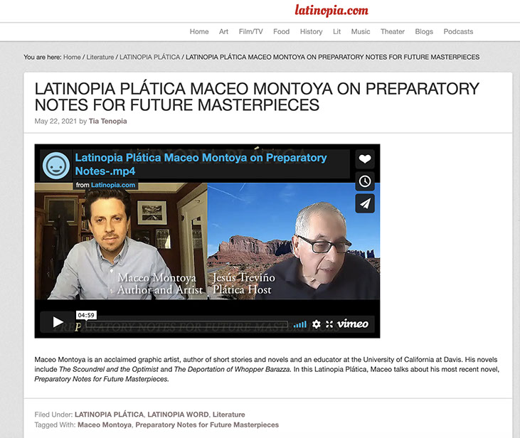 Maceo Montoya is a California-based author and artist who has published books in a variety of genres, including four works of fiction: The Scoundrel and the Optimist, The Deportation of Wopper Barraza, You Must Fight Them: A Novella and Stories, and Preparatory Notes for Future Masterpieces. Other works include Letters to the Poet from His Brother, a hybrid memoir combining images, prose poems, and essays, and Chicano Movement for Beginners, a work of graphic nonfiction. His most recent book, coauthored with Javier O. Huerta, is Imaginative Possibilities: Conversations with Twenty-First-Century Latinx Authors, which won a 2025 American Book Award.