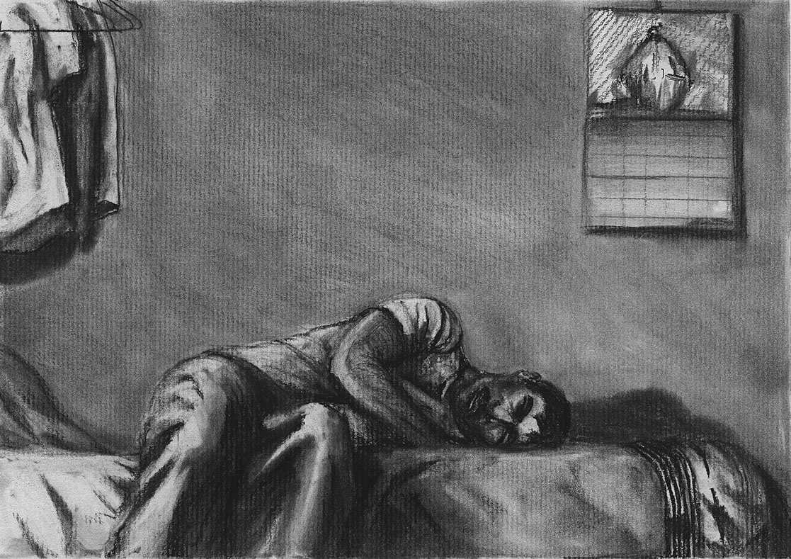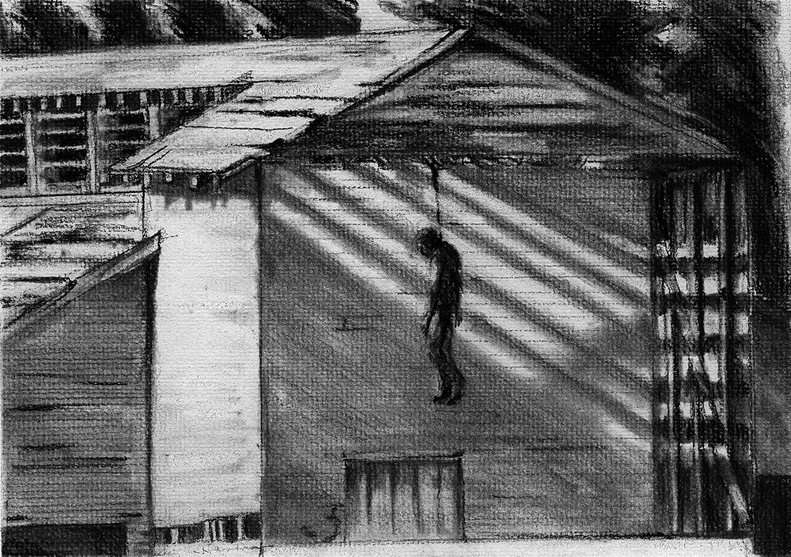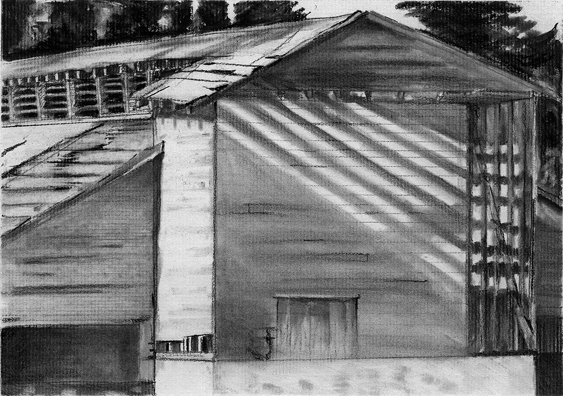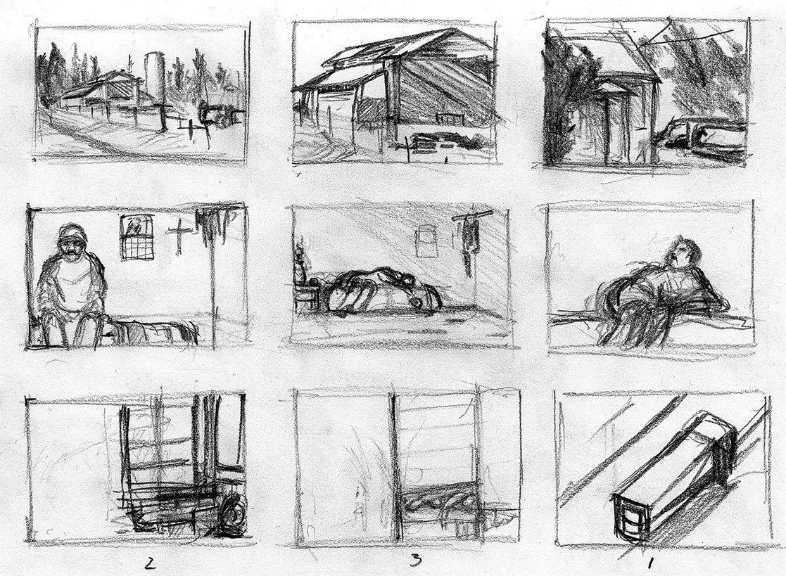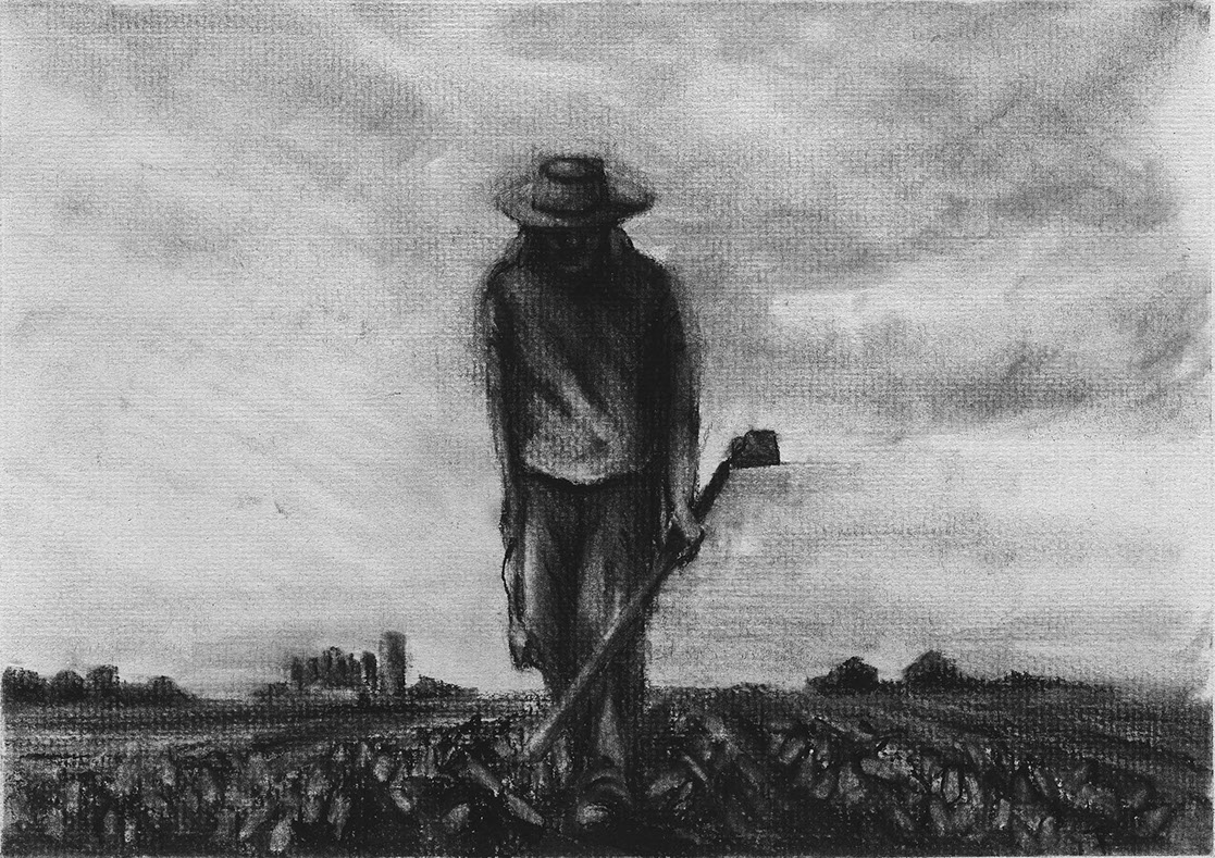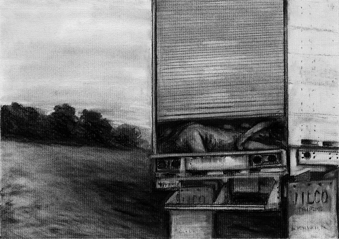The short film, Esperando, features 25 charcoal drawings strung together, overlapped, and repeated to tell the story of a solitary field worker as he awaits news from a family member attempting to cross the border. The image of the dead migrants in the abandoned tractor-trailer may be a memory, a dream, or a premonition. Whatever it is, the pain or doubt, the torture of esperando – waiting/hoping – inspires an image of his own death, hanging himself by the rafter of an abandoned barn, the idea of which brings the religious man to his knees begging forgiveness.