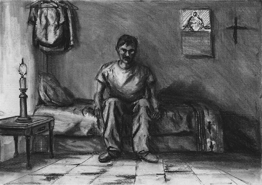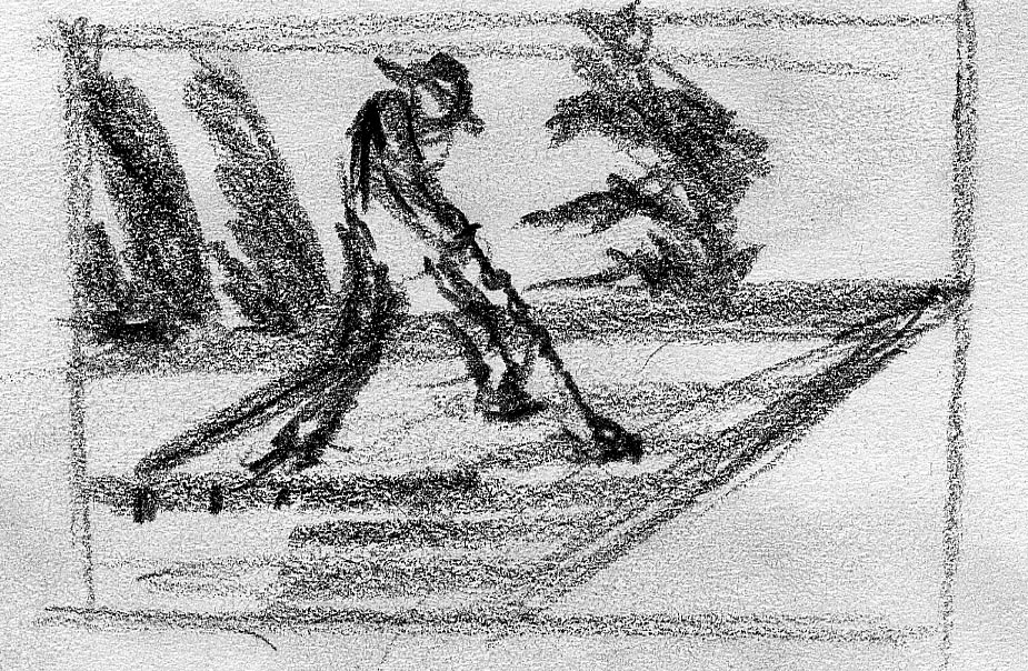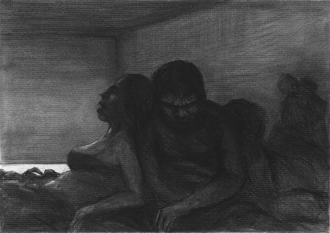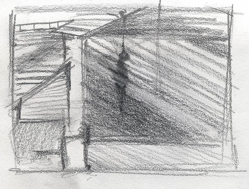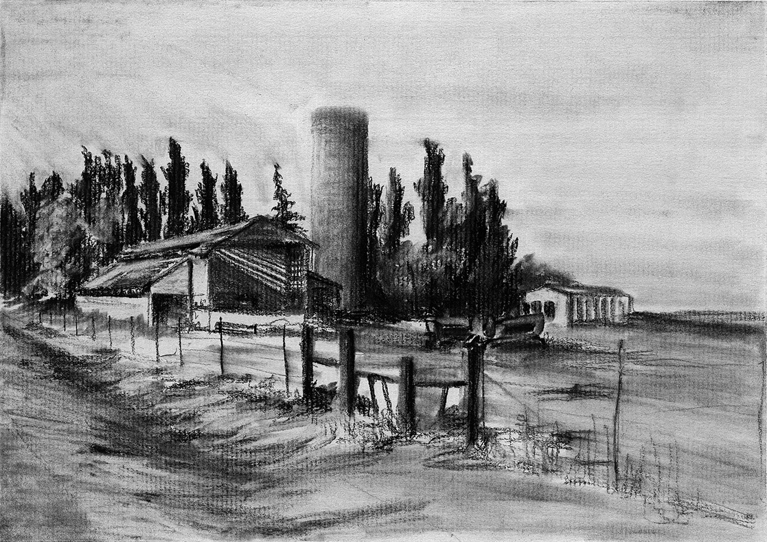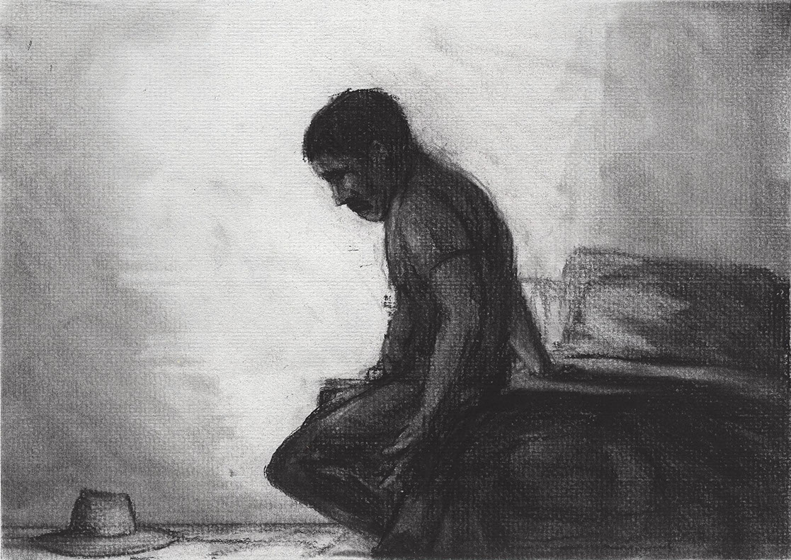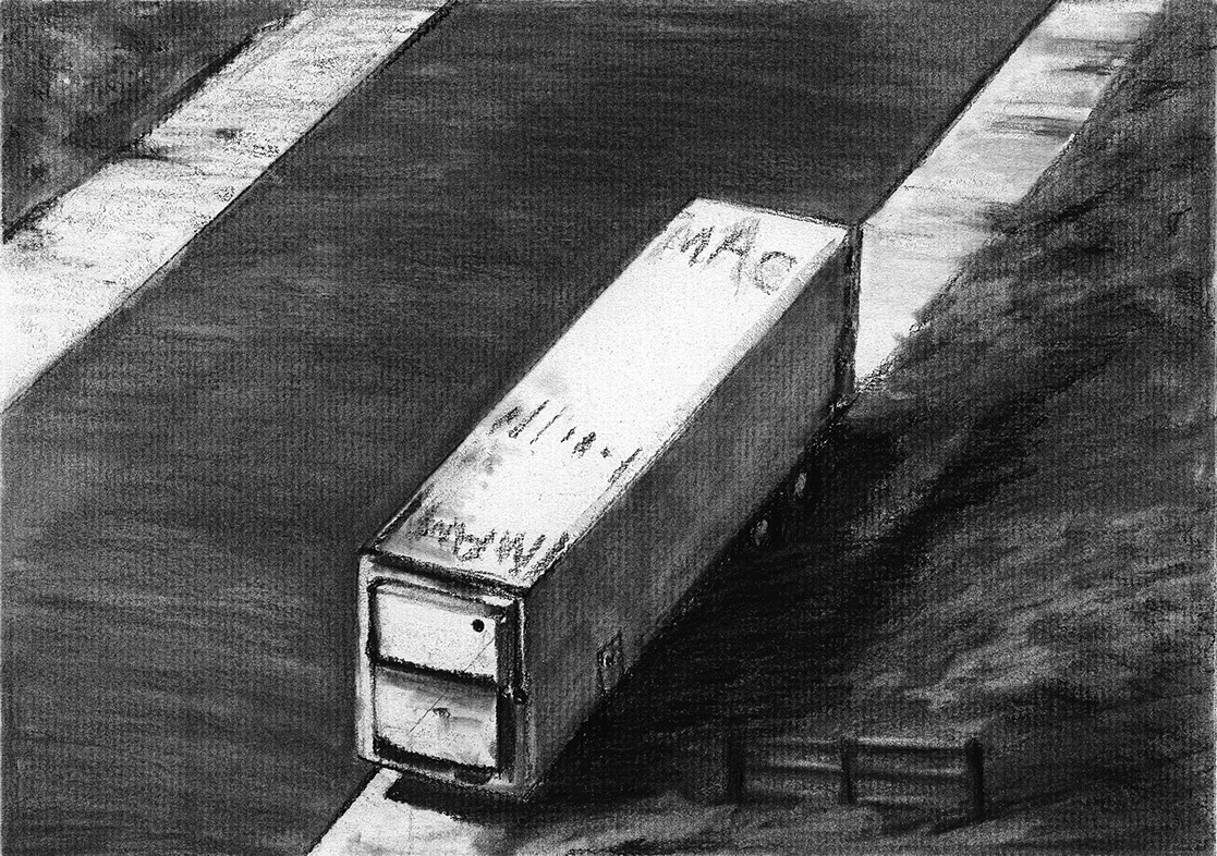 The short film, Esperando, features 25 charcoal drawings strung together, overlapped, and repeated to tell the story of a solitary field worker as he awaits news from a family member attempting to cross the border. The image of the dead migrants in the abandoned tractor-trailer may be a memory, a dream, or a premonition. Whatever it is, the pain or doubt, the torture of esperando – waiting/hoping – inspires an image of his own death, hanging himself by the rafter of an abandoned barn, the idea of which brings the religious man to his knees begging forgiveness.