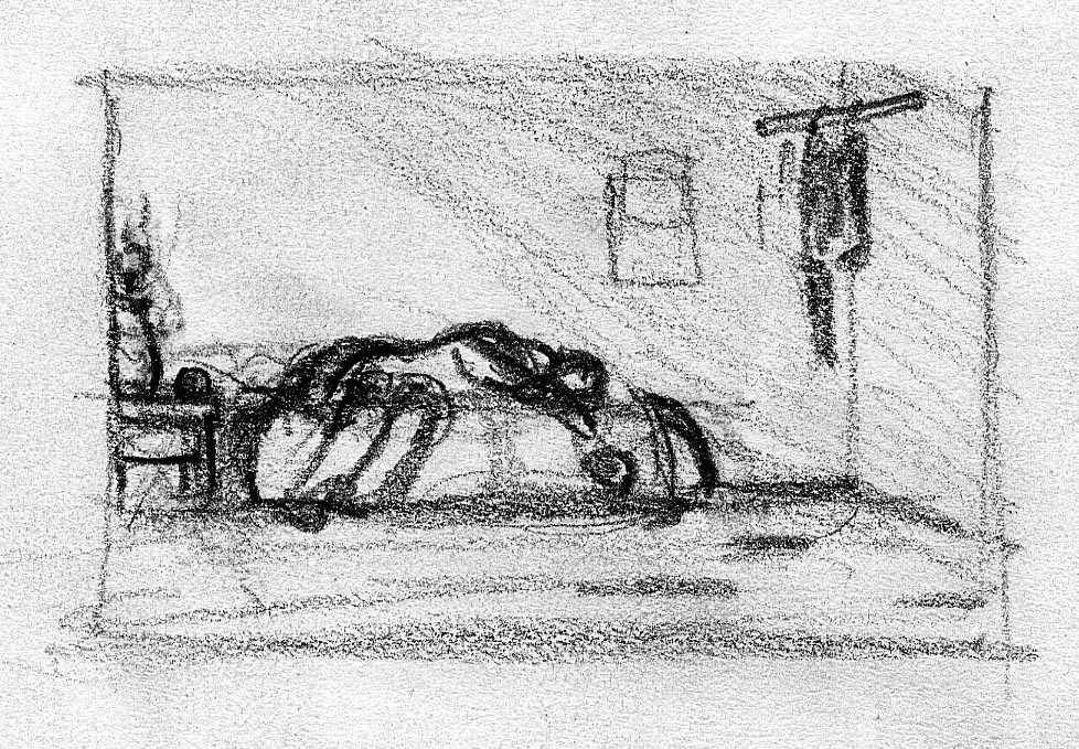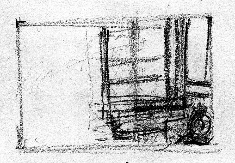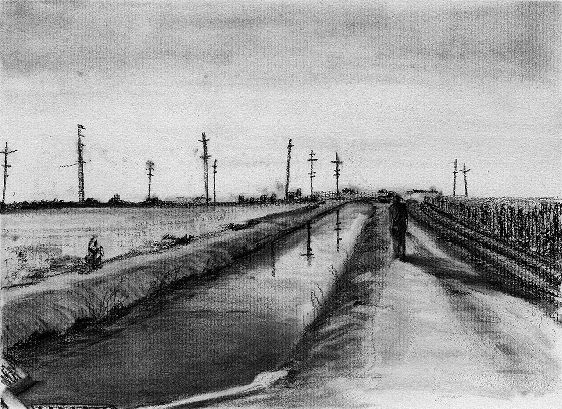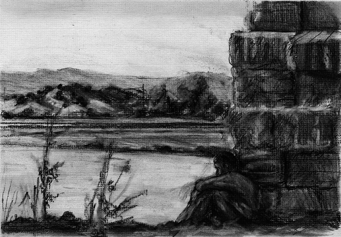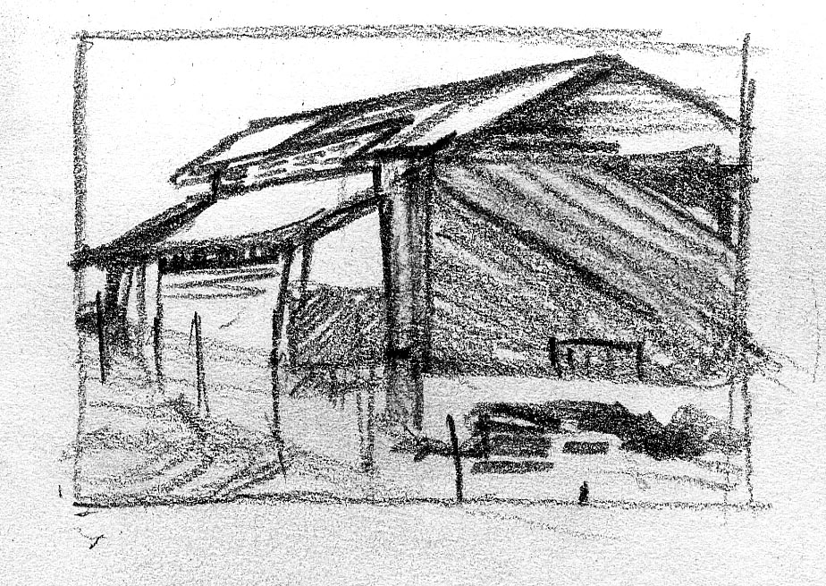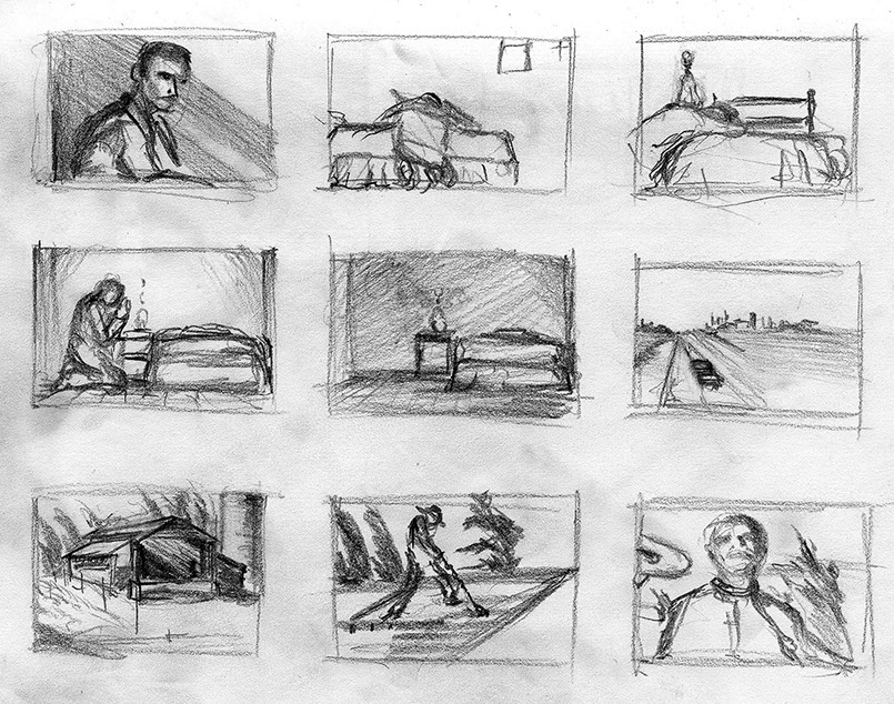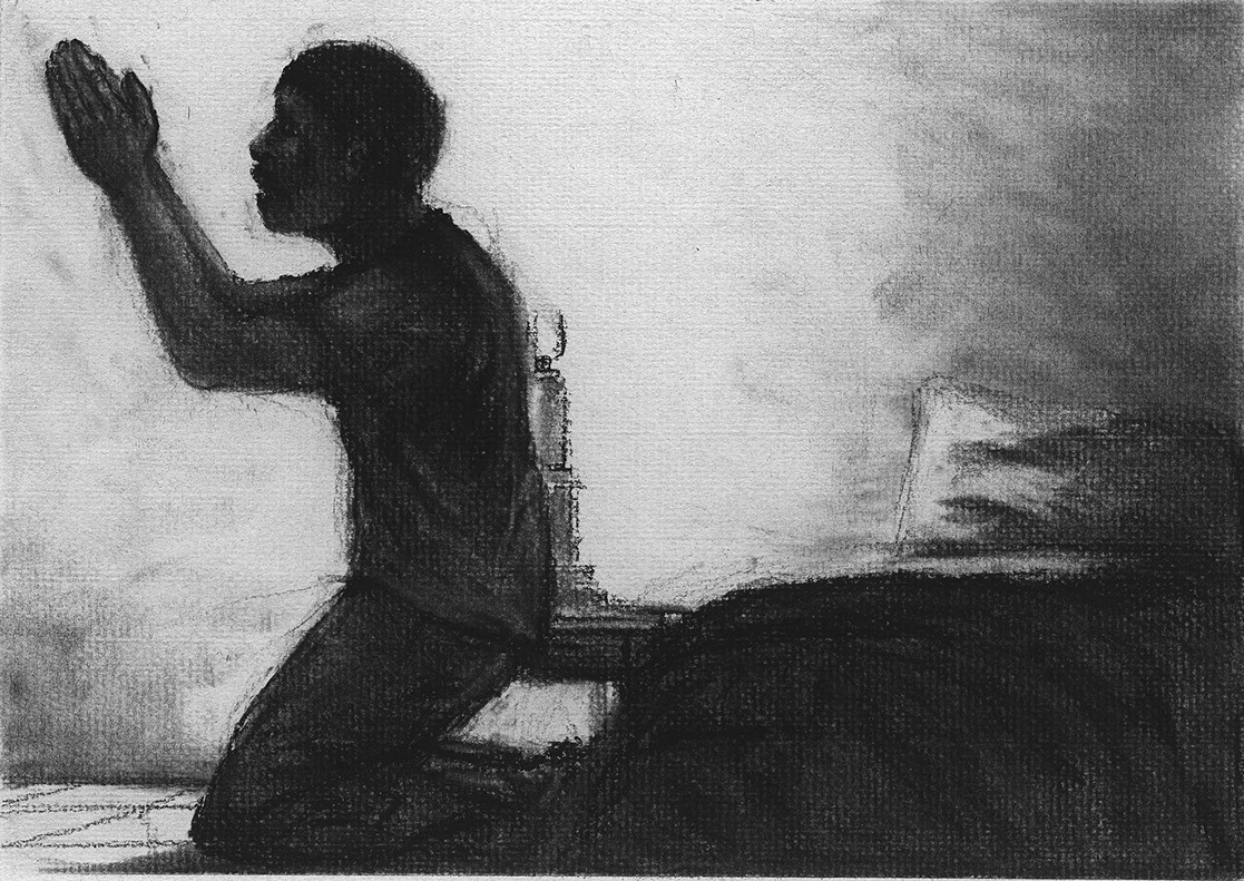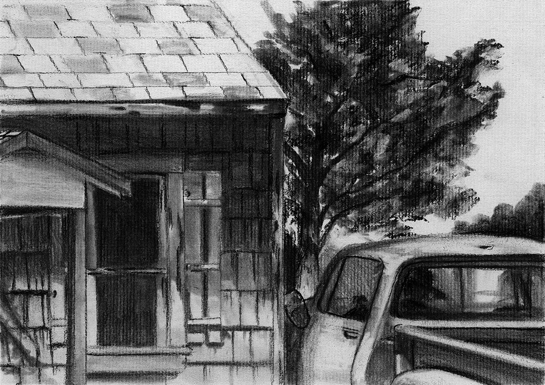 The short film, Esperando, features 25 charcoal drawings strung together, overlapped, and repeated to tell the story of a solitary field worker as he awaits news from a family member attempting to cross the border. The image of the dead migrants in the abandoned tractor-trailer may be a memory, a dream, or a premonition. Whatever it is, the pain or doubt, the torture of esperando – waiting/hoping – inspires an image of his own death, hanging himself by the rafter of an abandoned barn, the idea of which brings the religious man to his knees begging forgiveness.