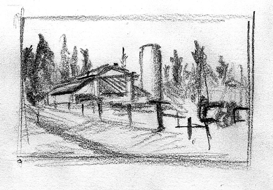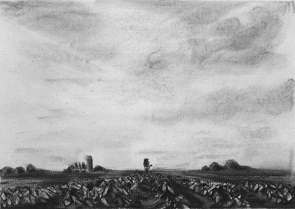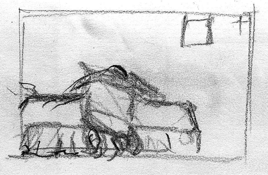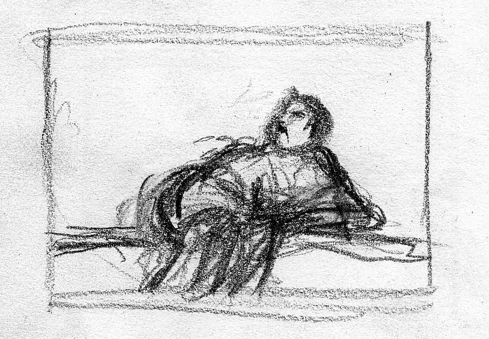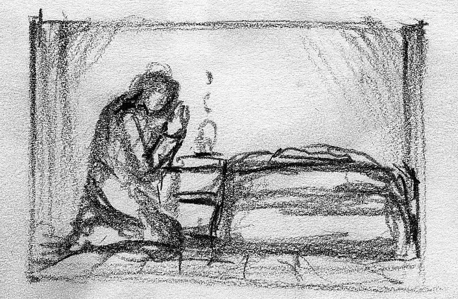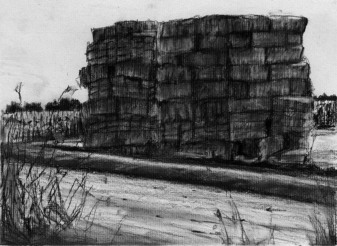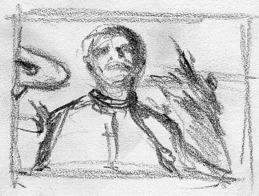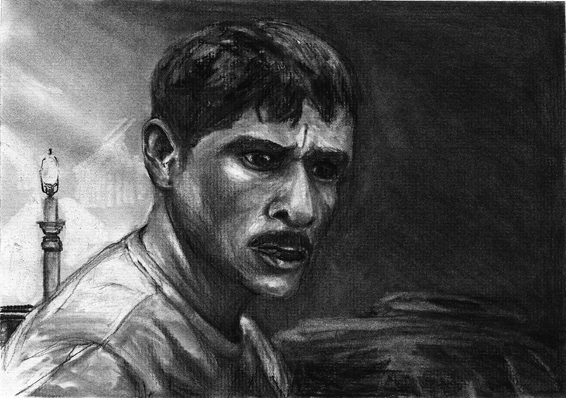 The short film, Esperando, features 25 charcoal drawings strung together, overlapped, and repeated to tell the story of a solitary field worker as he awaits news from a family member attempting to cross the border. The image of the dead migrants in the abandoned tractor-trailer may be a memory, a dream, or a premonition. Whatever it is, the pain or doubt, the torture of esperando – waiting/hoping – inspires an image of his own death, hanging himself by the rafter of an abandoned barn, the idea of which brings the religious man to his knees begging forgiveness.